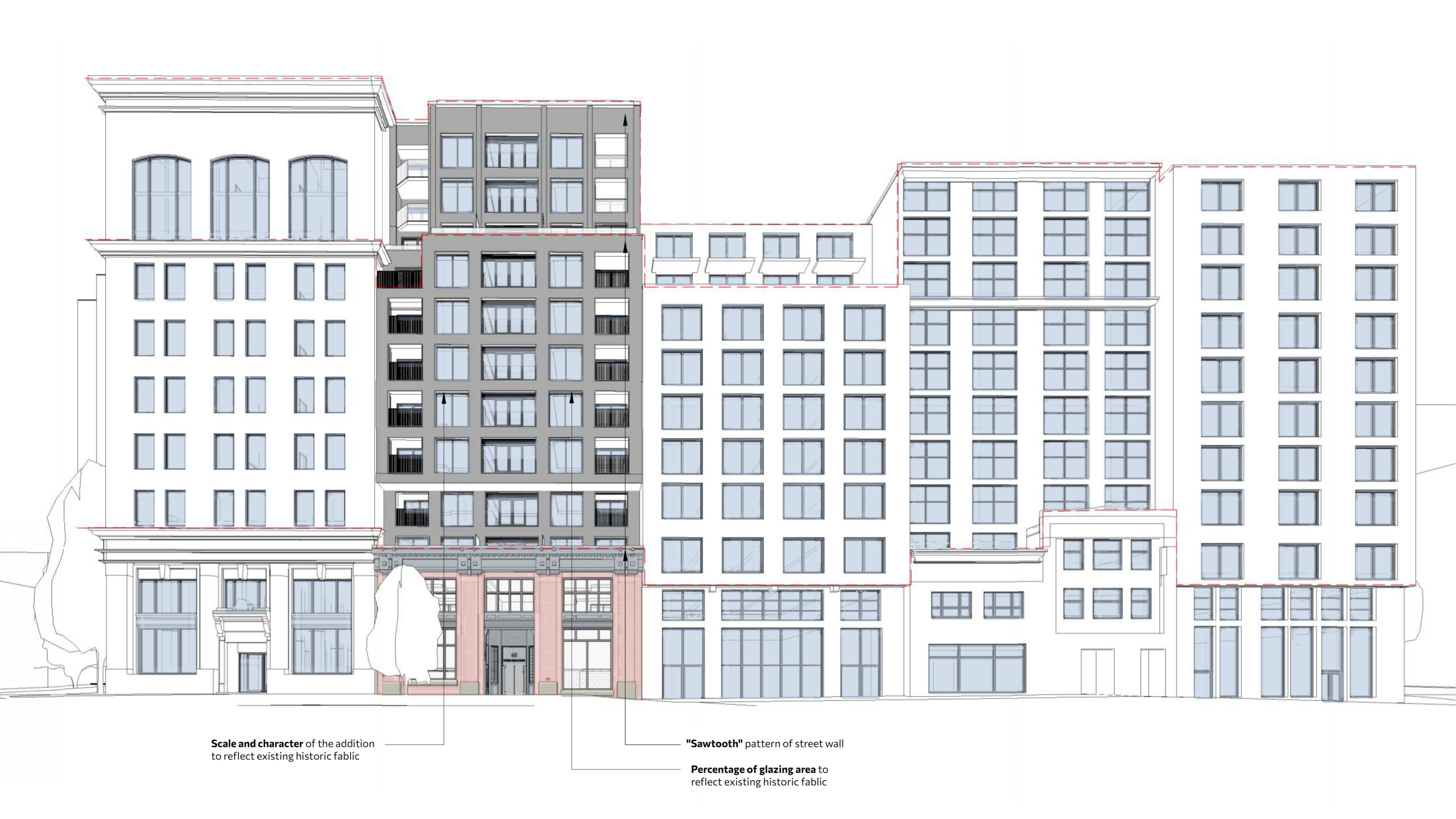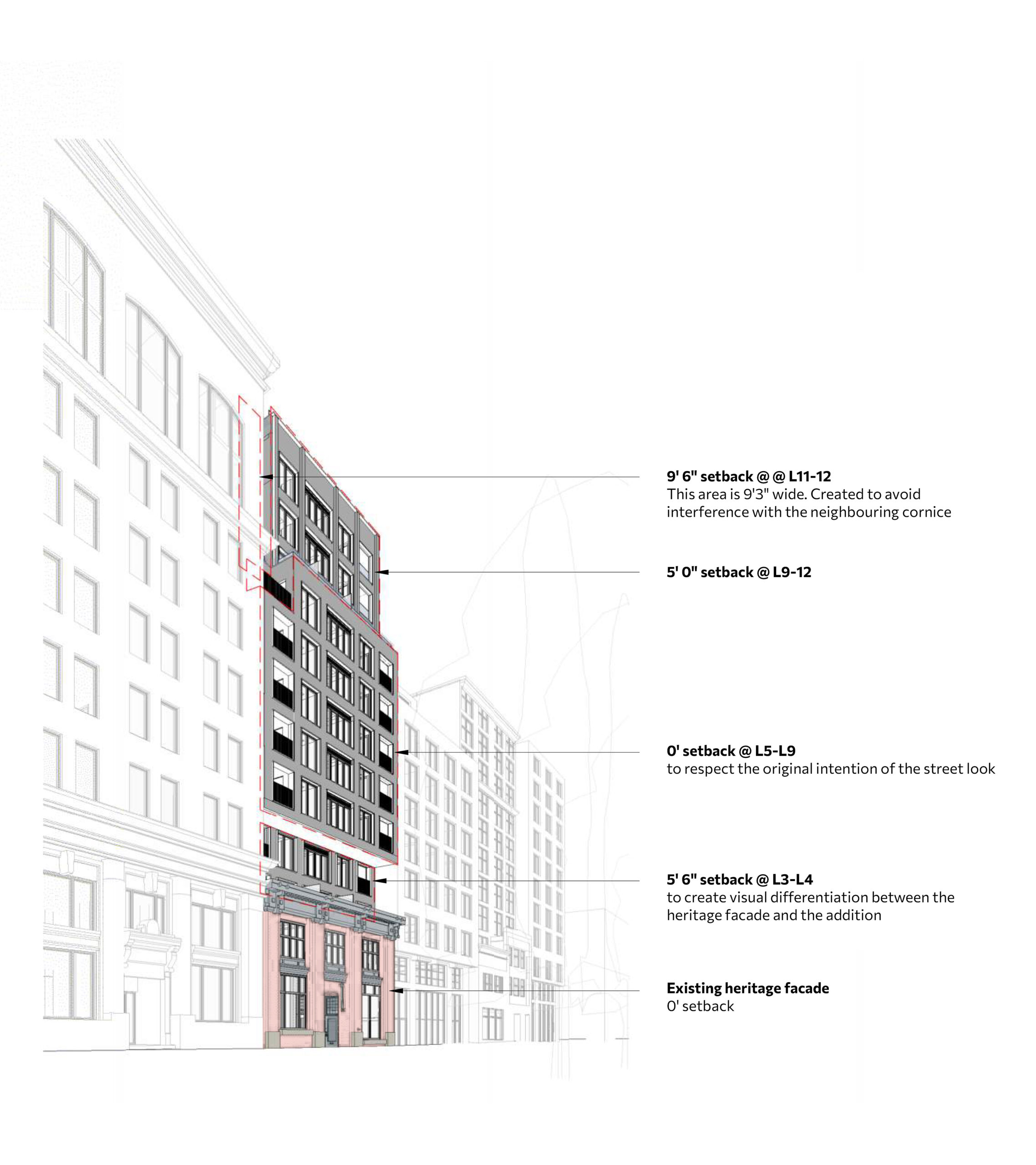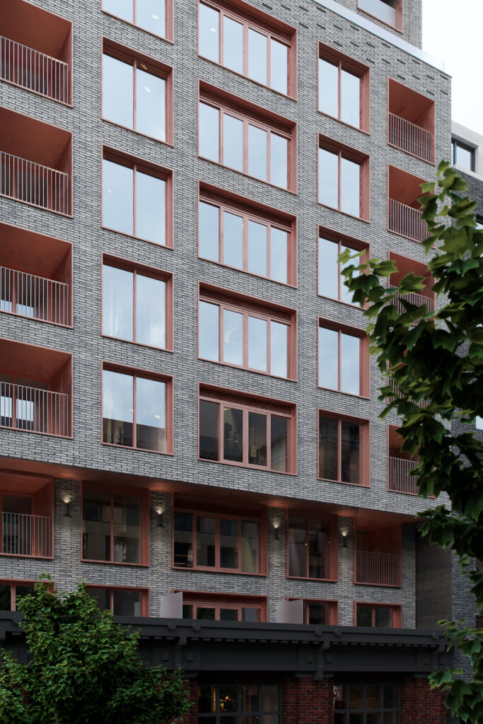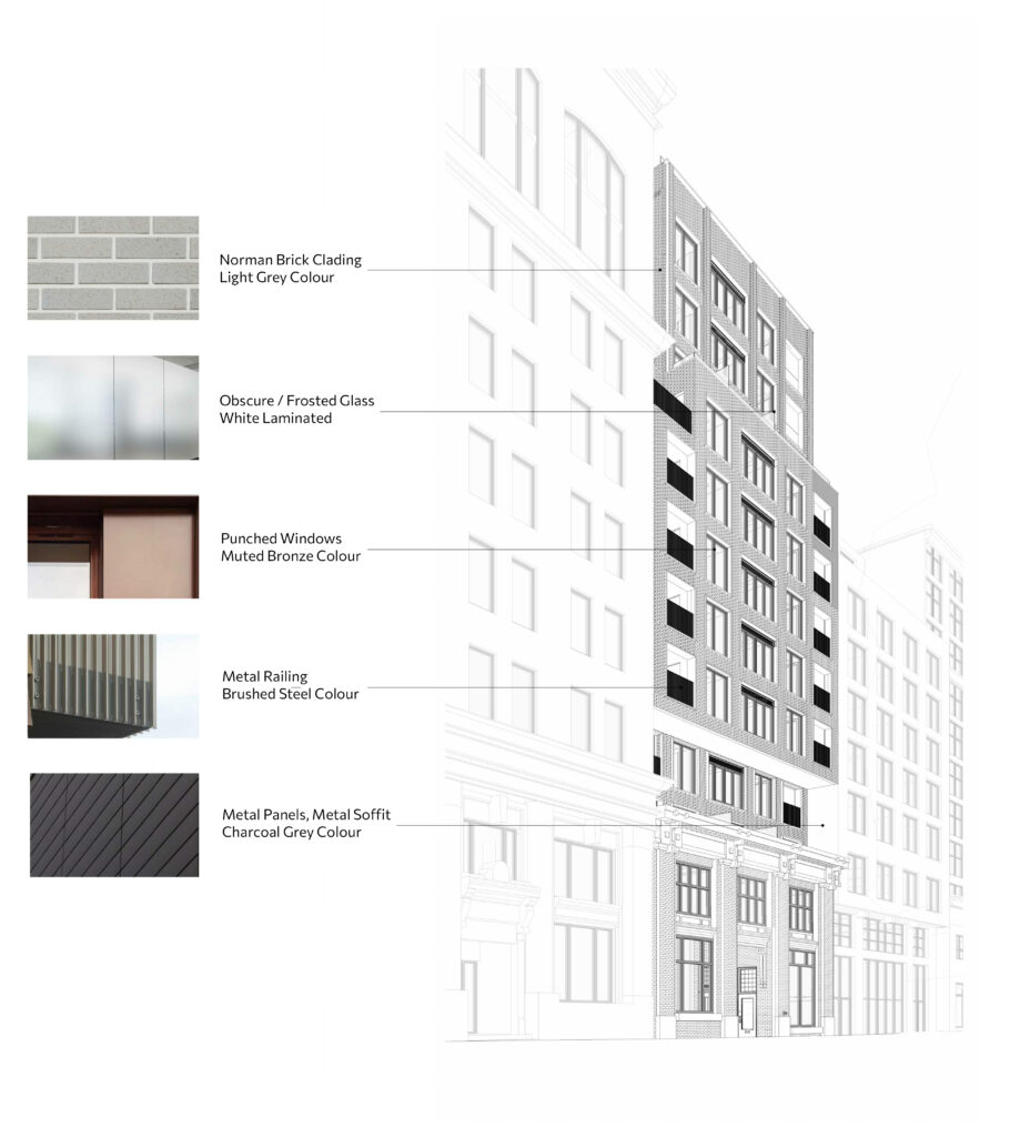 Material selection reinforces this narrative of heritage and evolution. While the original façade remains intact, the residential tower above is clad in light grey brick to complement but differentiate itself from the historic brickwork below. Punched window openings framed in bronze metal add warmth and refinement, while the top floors step back and continue the same material palette to align with surrounding architectural rhythms. Together, the retained heritage and the modern addition tell a unified story of preservation, city-building, and respectful transformation.