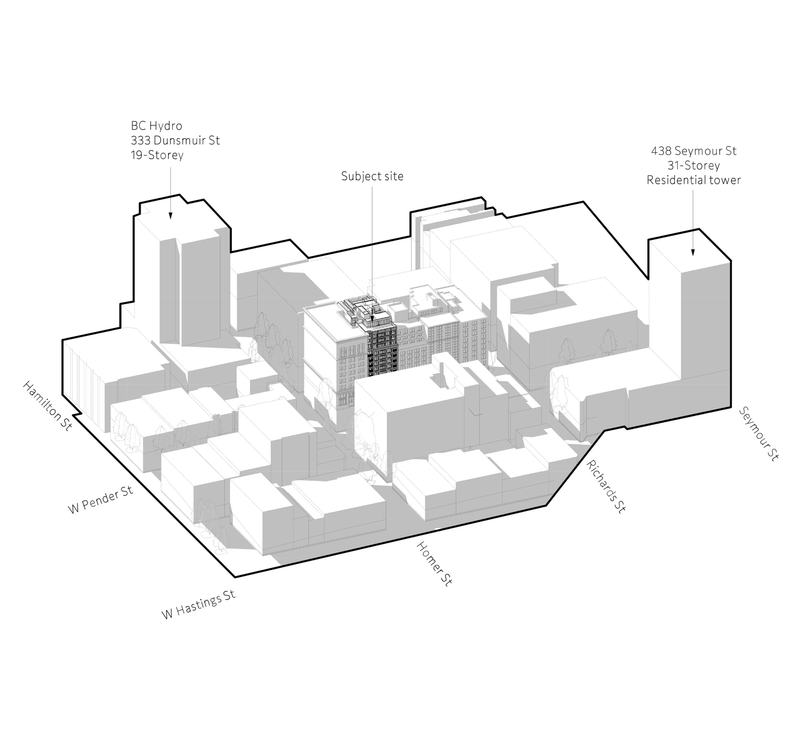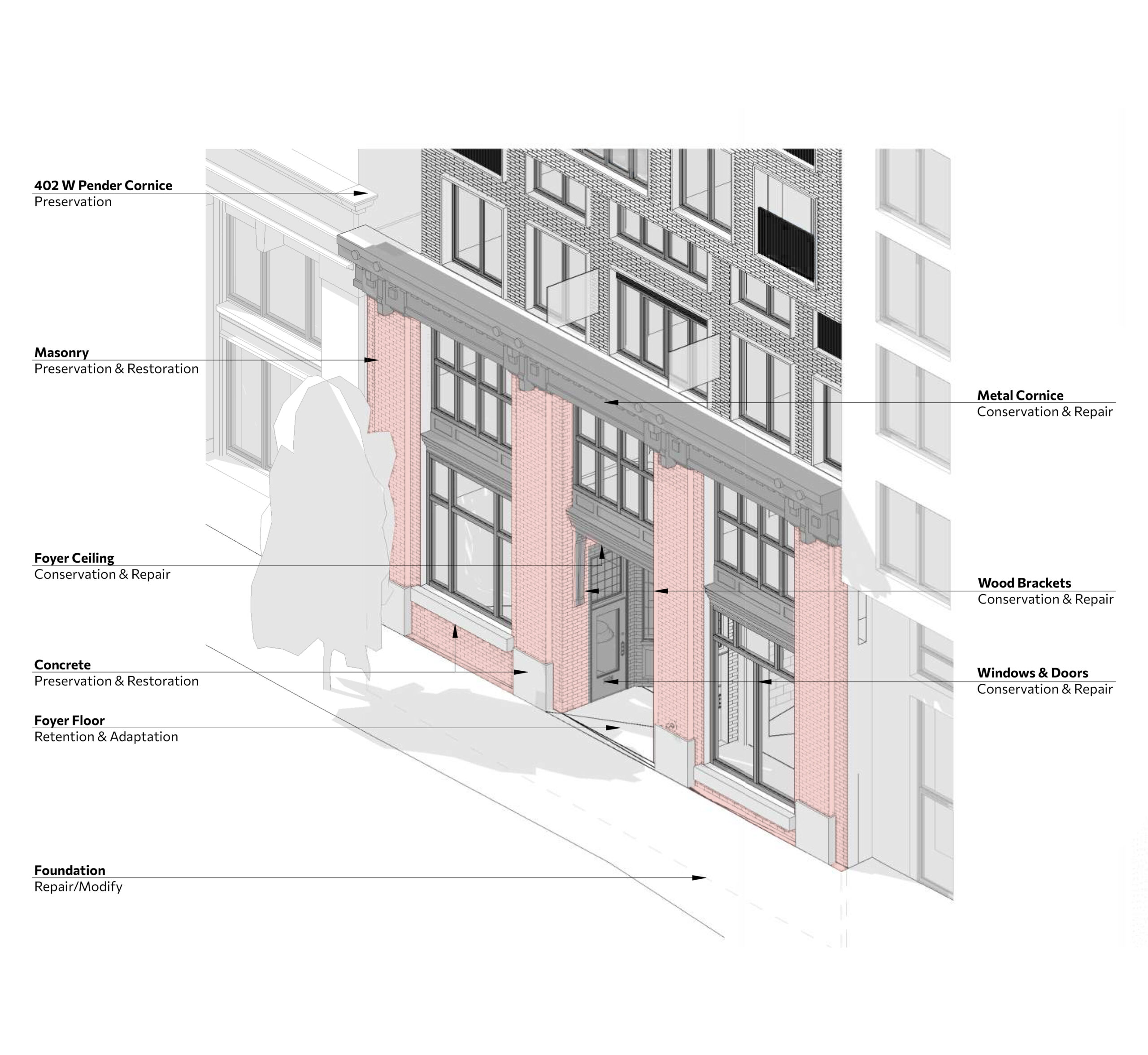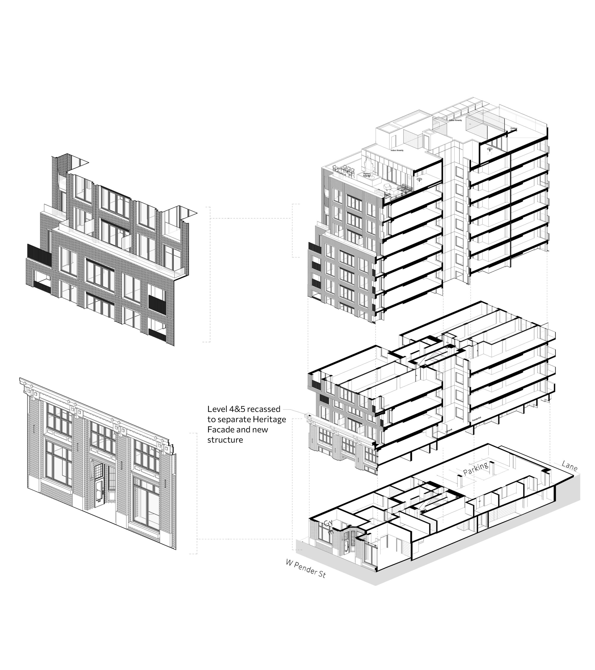 A defining aspect of the design is the respectful retention of the Western Canada Building, valued for its classical detailing and significant role in the financial and commercial history of early Vancouver. The original façade and entry foyer will be preserved and restored, using archival and on-site evidence to guide interventions. A stepped-back massing above the heritage frontage creates a visible transition between old and new, while materials salvaged from deconstruction—such as original timber—may be reused on site to strengthen the continuity of place.