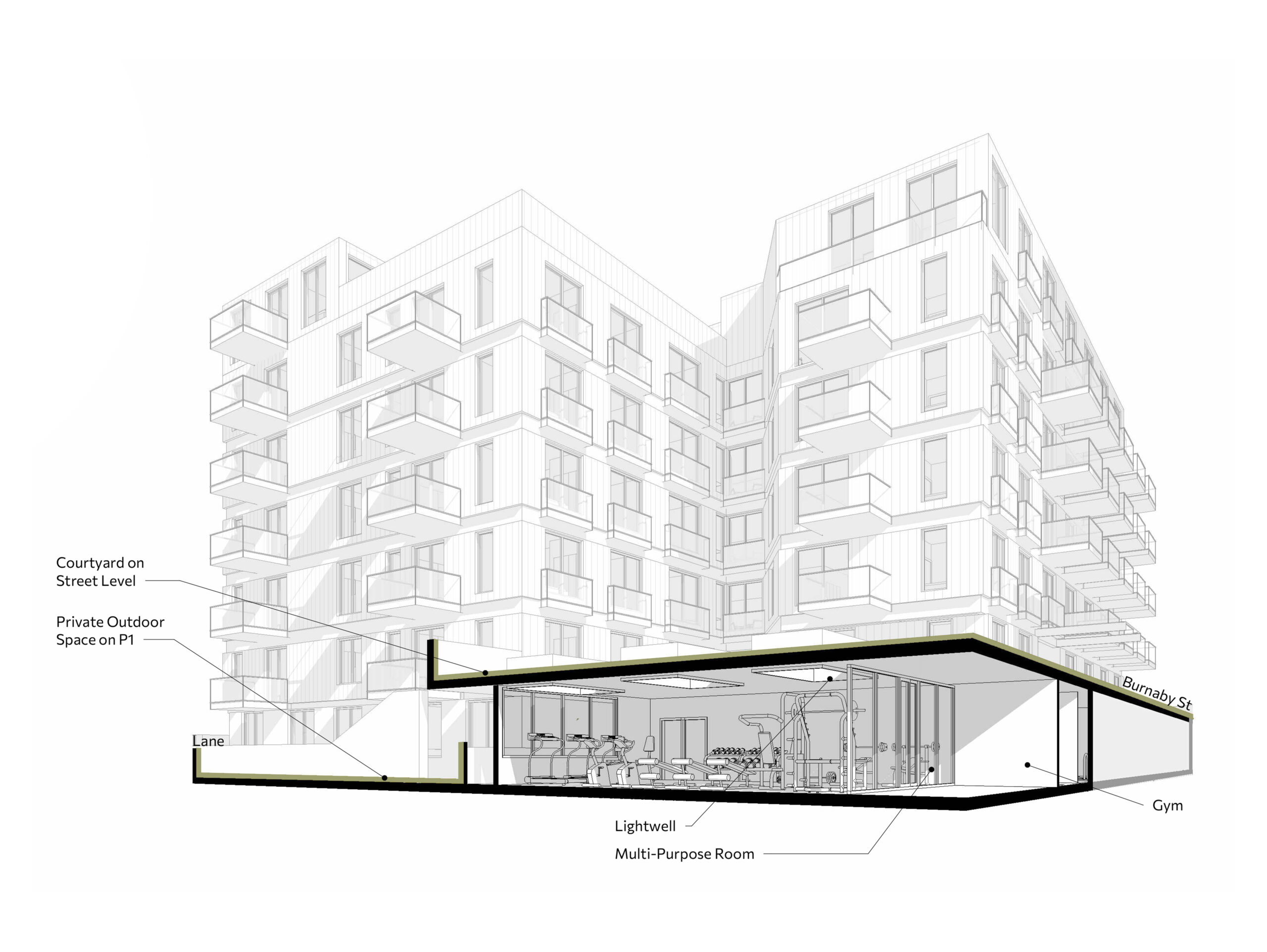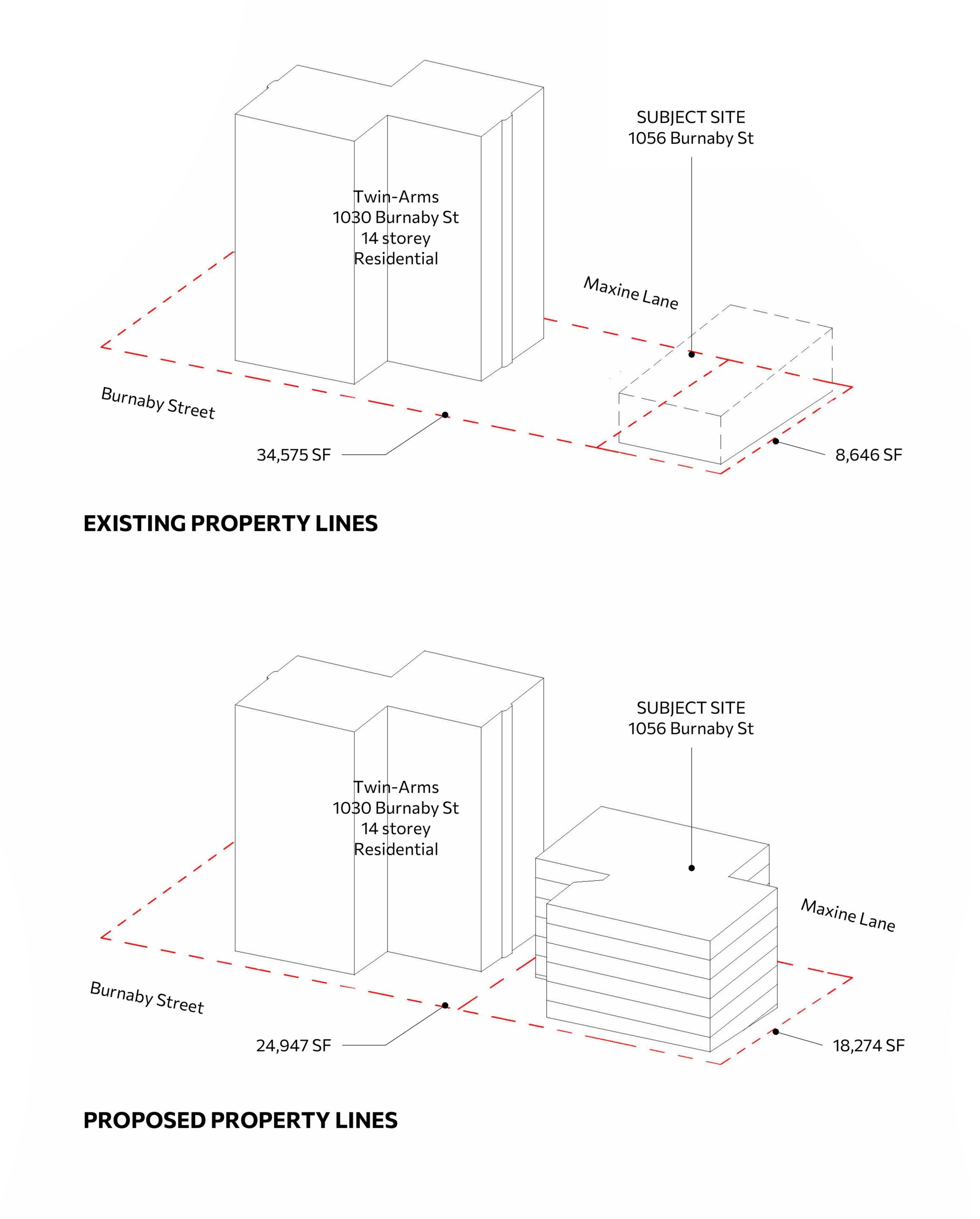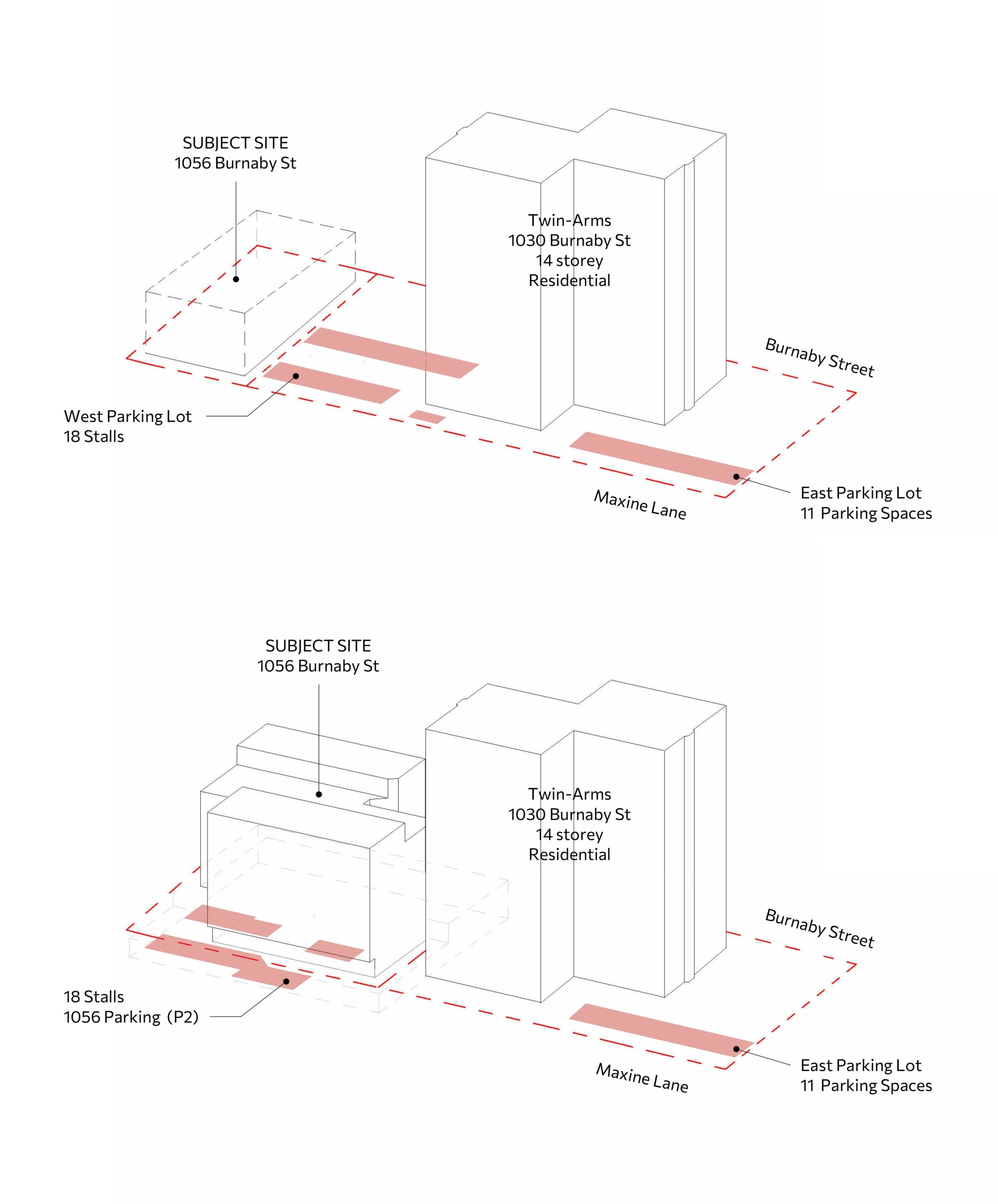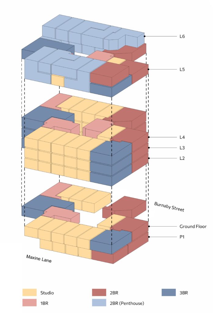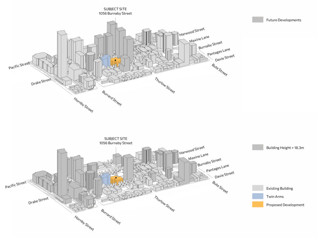 The proposed development at 1056 Burnaby Street begins from a fundamental question: what story does this place need to tell? In the heart of Vancouver’s West End, the site offers an opportunity to expand the narrative of inclusive, accessible, and affordable housing within one of the city’s most established neighbourhoods. Currently occupied by a small 23-unit building, the project seeks to reshape the site so it can tell a new story—one of continuity, renewal, and community connection—while respecting the residential character already present in the area. By combining the site with the adjacent 1030 Burnaby Street lot, home to the longstanding Twin Arms senior residence, the project enables a larger and more coherent development that supports both existing and future residents.