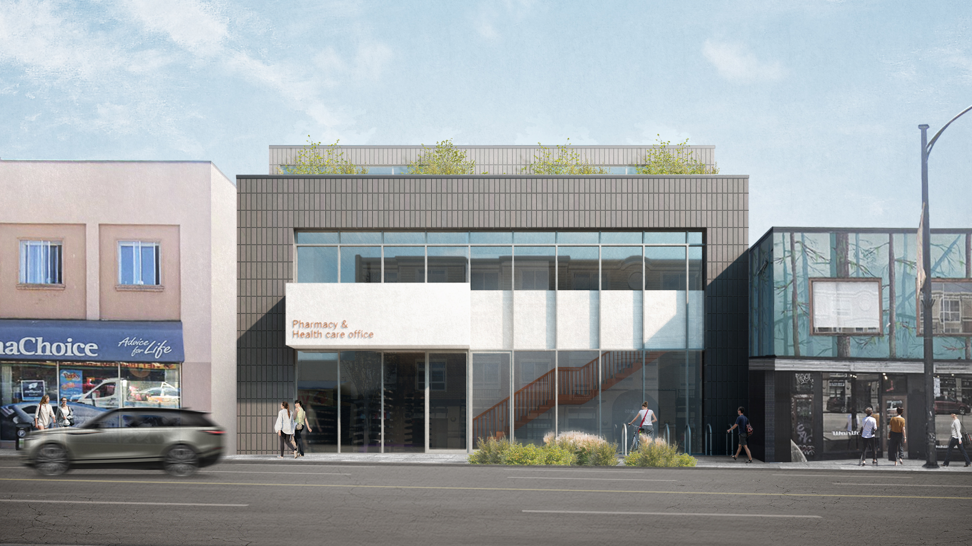Located along East Hastings in Vancouver’s Grandview-Woodland neighborhood, this project is designed to serve a growing residential community with accessible, locally operated healthcare services. The client sought a pharmacy, medical clinic, and general office space within a modest budget, prompting the design team to ask: what story does this place need to tell? The result is a building that reflects practicality, community value, and a strong urban presence without the need for rezoning or costly underground construction.
