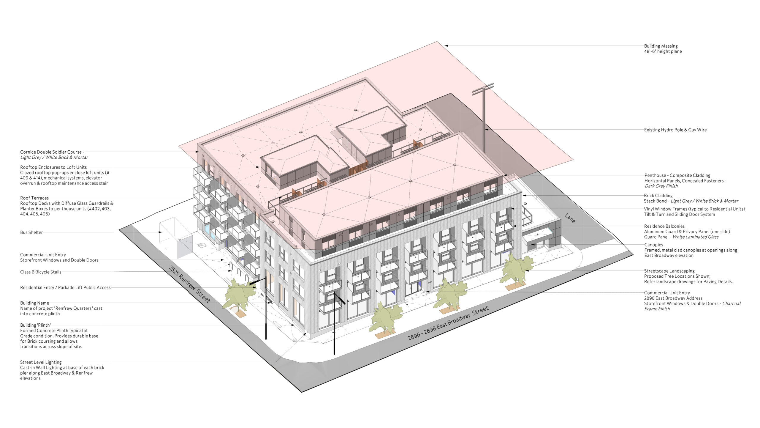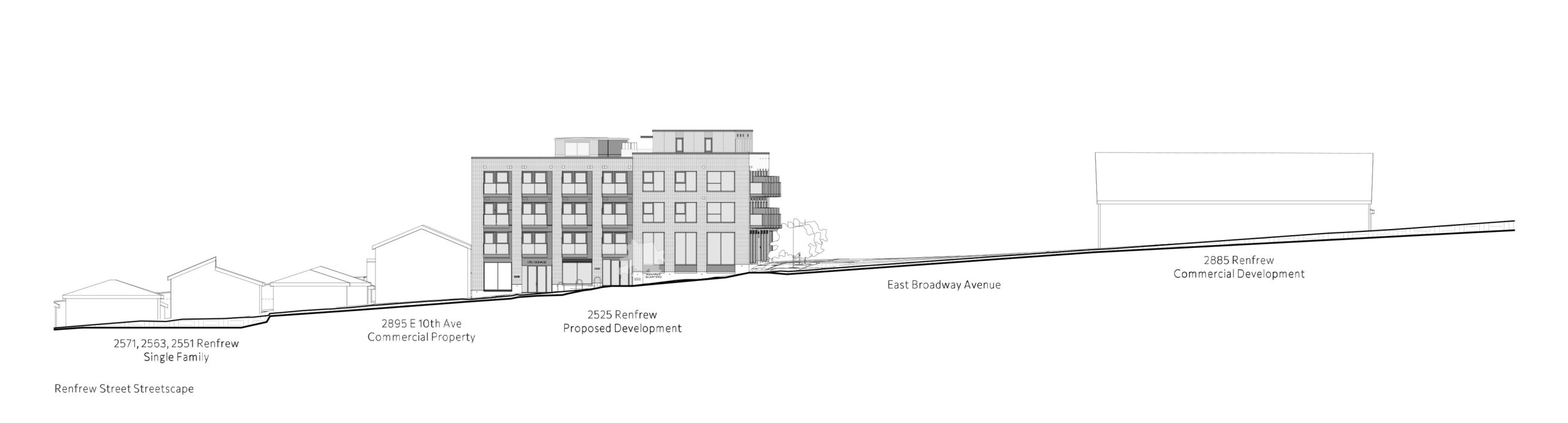 The proposed development at 2525 Renfrew Street was created under Vancouver’s Rental 100 Secured Market Rental Housing policy and follows the C-2 district guidelines for form, height, setbacks, and density. The site was rezoned from C-1 to CD-1 to support a mixed-use building that steps down the steeply sloped terrain. The project consists of a split-level four-storey structure—perceived as five storeys along the lower elevation—with three ground-floor commercial units and 37 secured rental homes. The terraced design allows each CRU and all residential units to maintain convenient access to garbage, loading, and service areas.