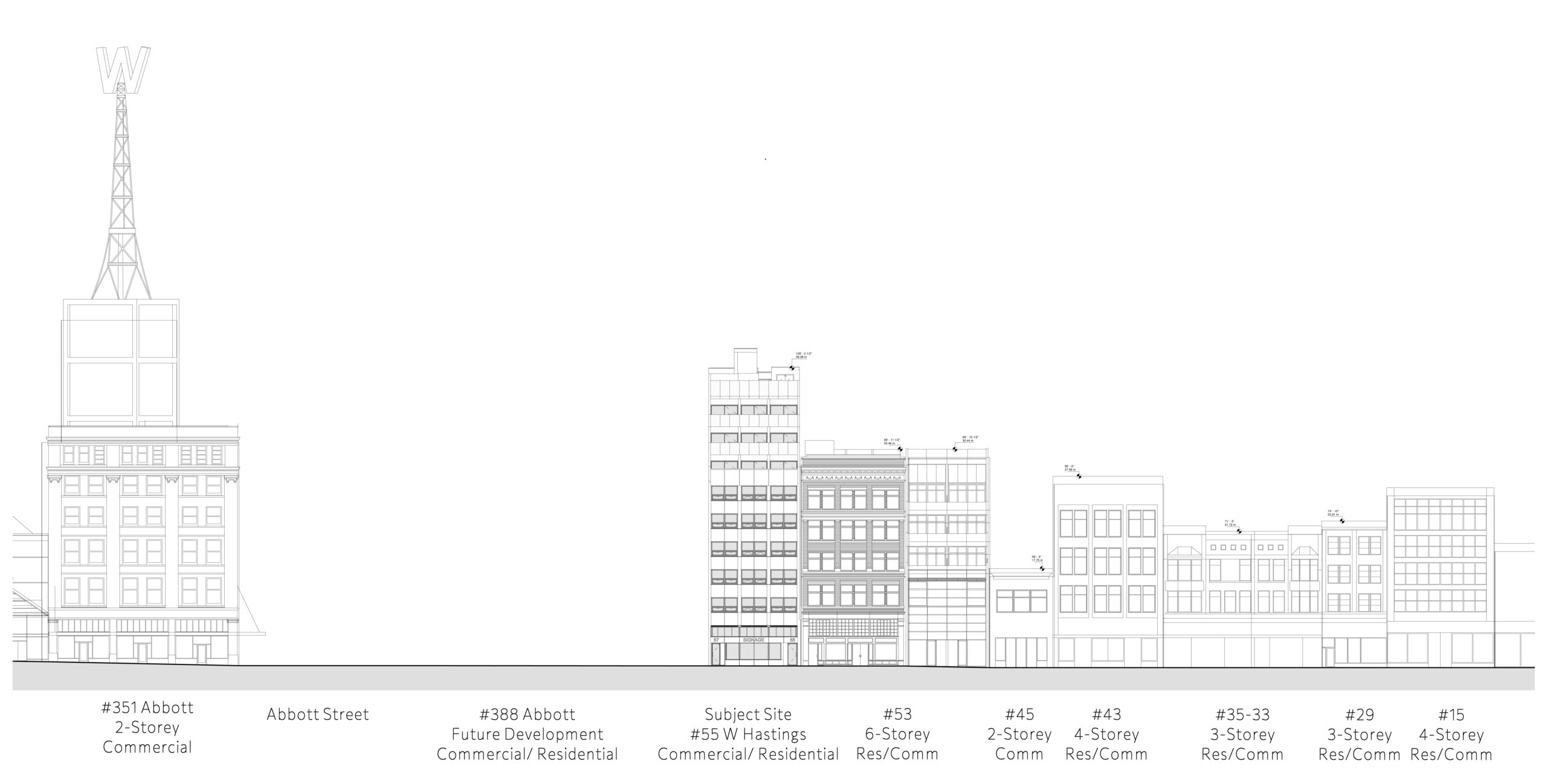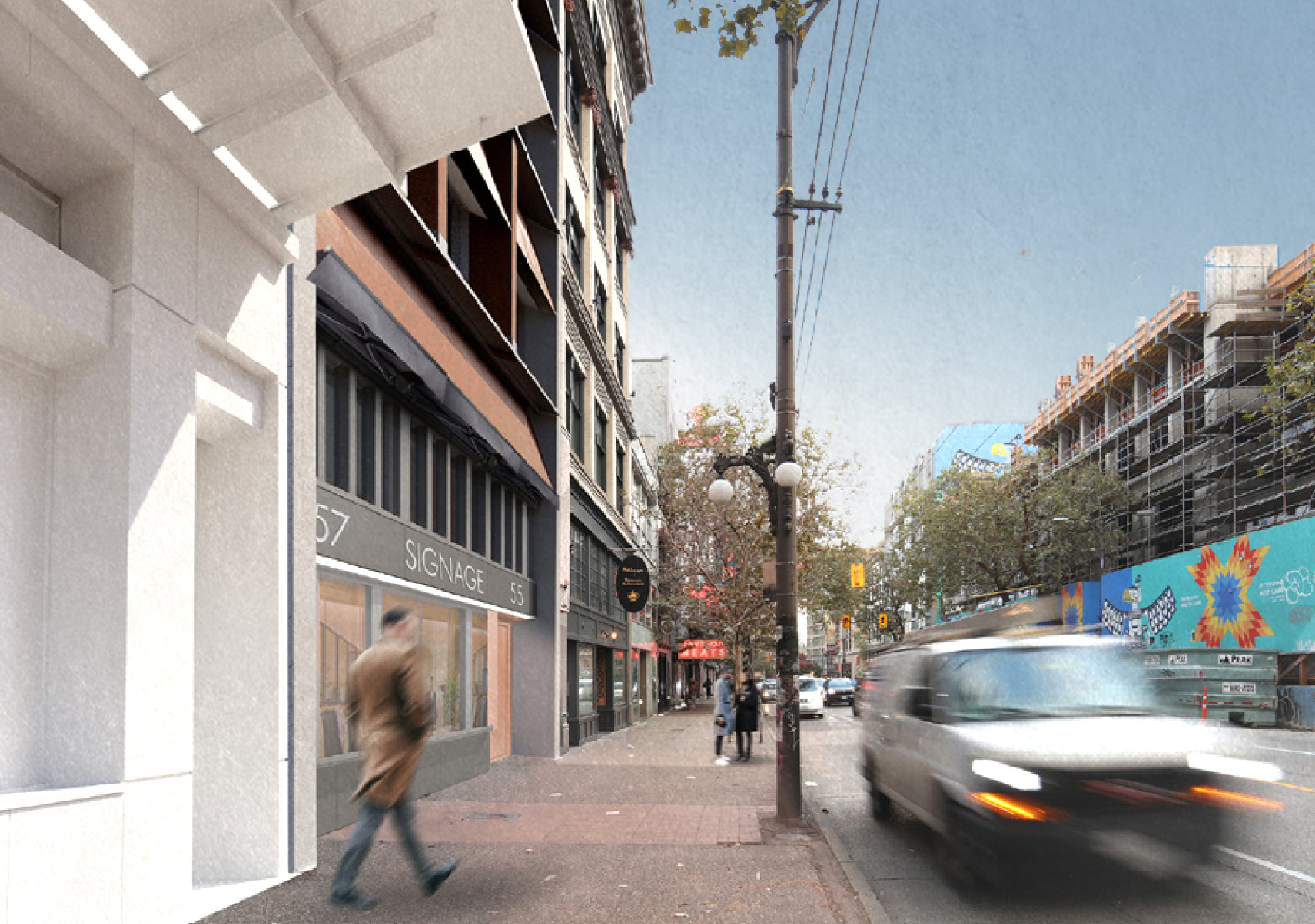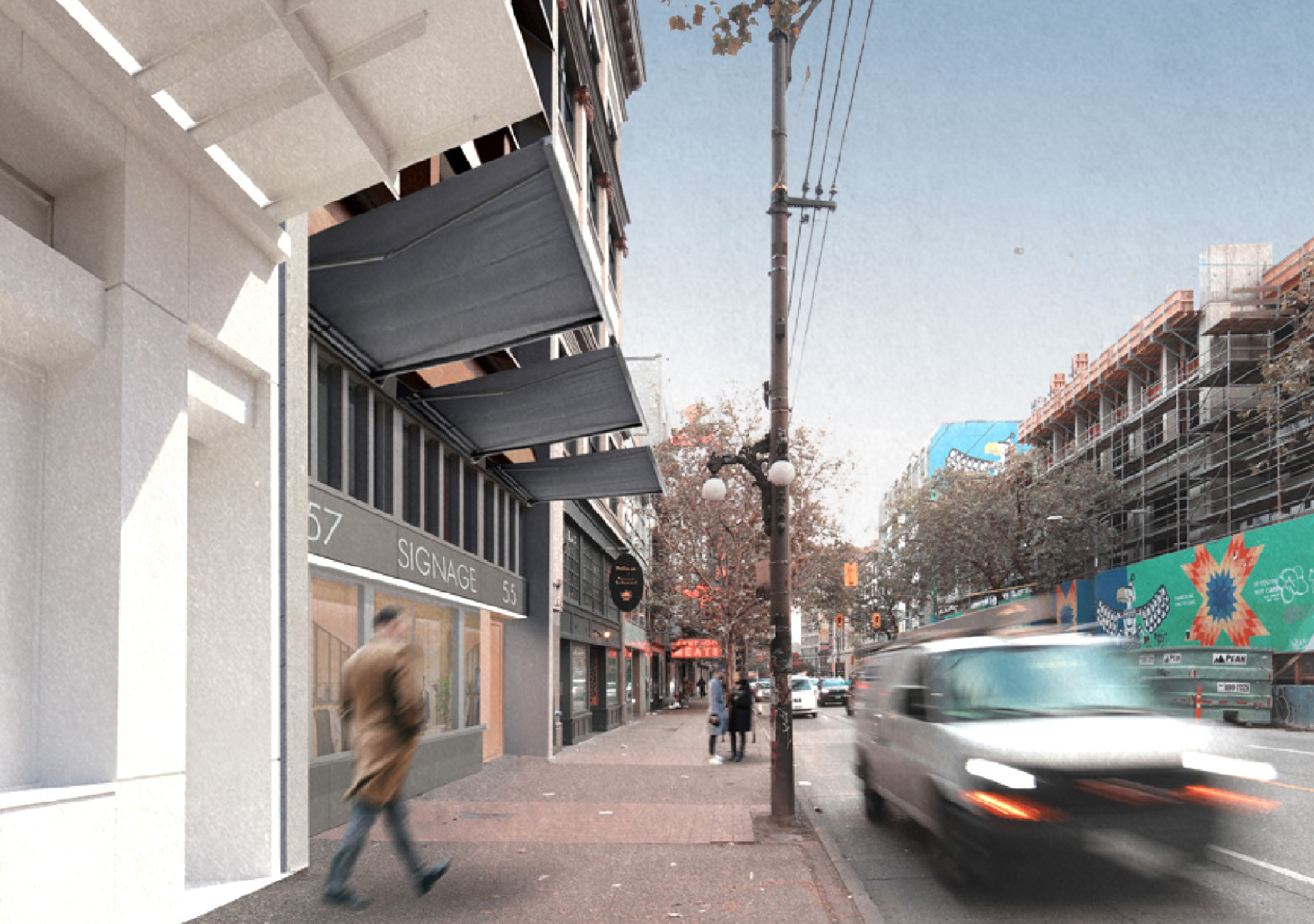 The design begins with the question: What story does this place need to tell? Situated between historic and eclectic neighboring buildings, the project seeks to contribute a contemporary chapter to Granville Street’s layered urban fabric. The massing and glazed expression are intentionally modern and minimal, creating a refined contrast while maintaining a strong human-scaled relationship to the street.