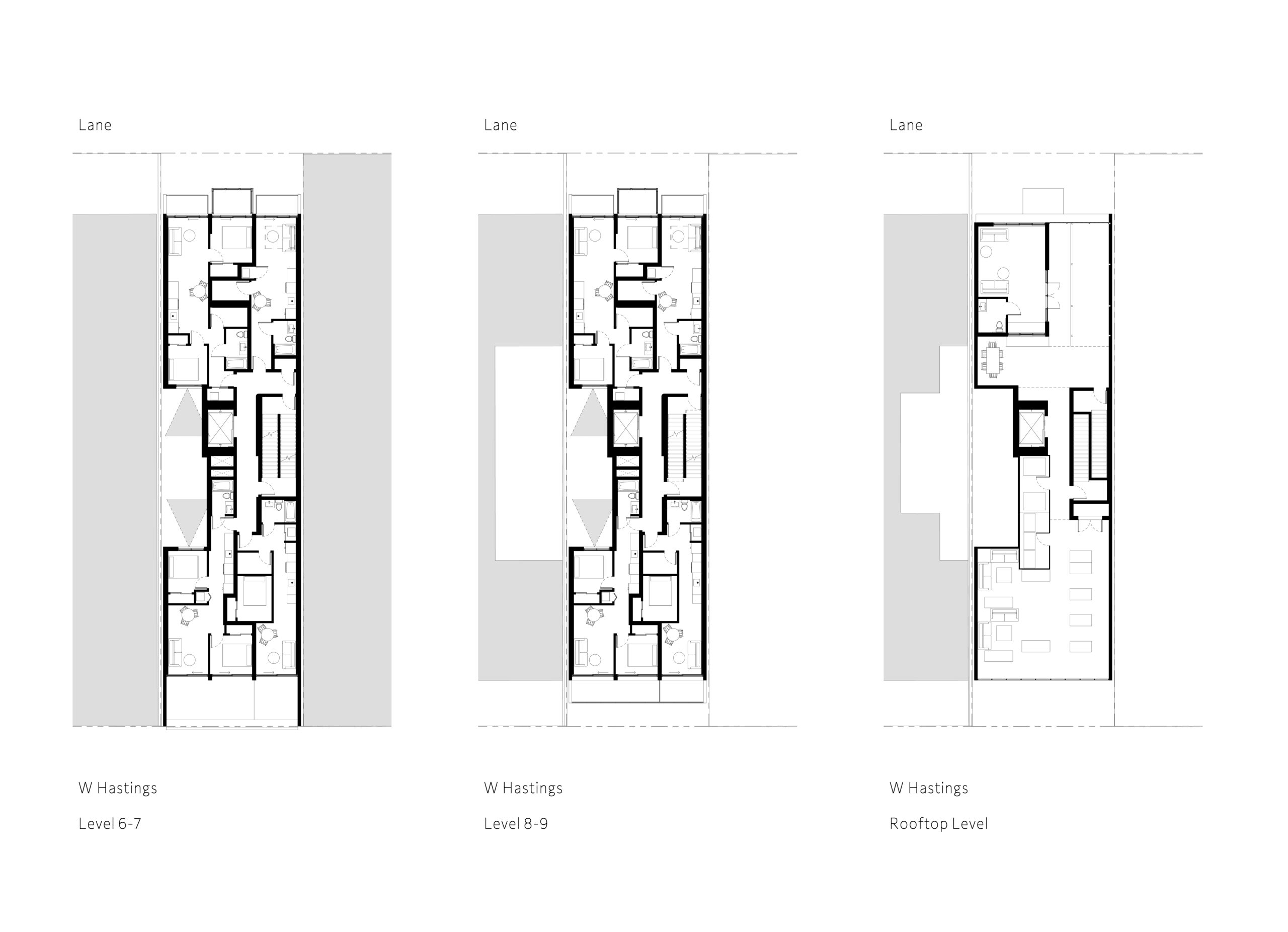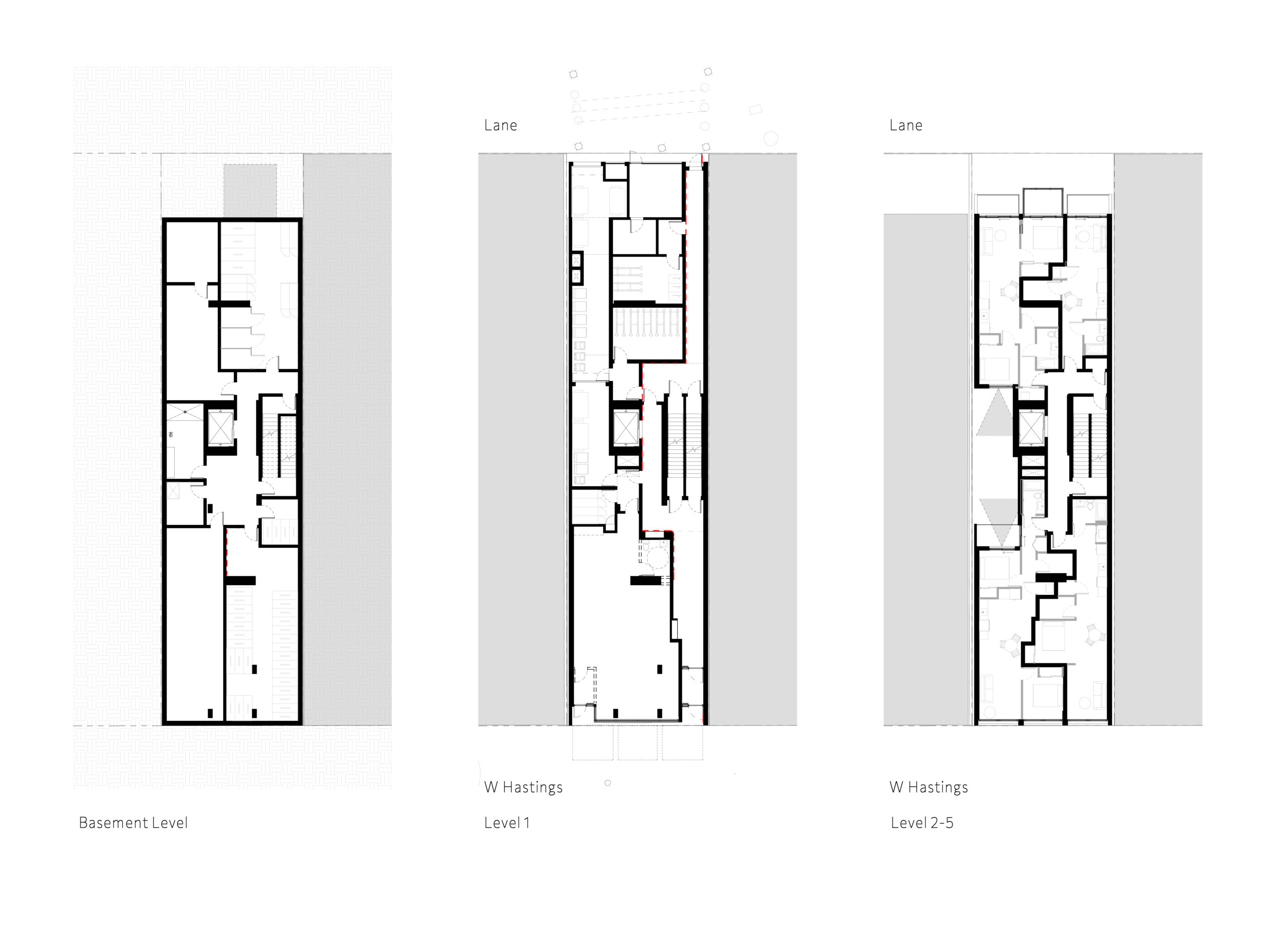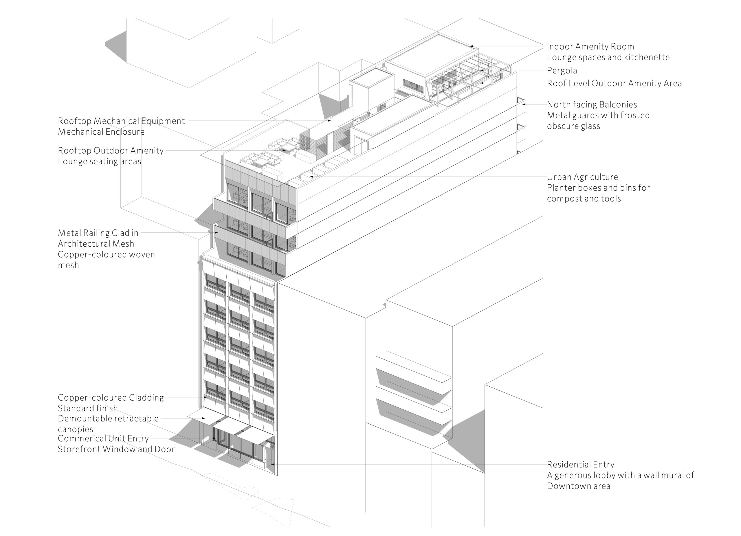 Architecturally, the building tells a story of scale, texture, and public presence. A four-storey brick podium establishes a strong, durable street wall, while recessed, lighter metal cladding on the upper levels reduces visual massing and respects the neighbourhood context. Continuous canopies and a widened sidewalk enhance the pedestrian experience, reinforcing East Hastings as an active urban frontage. At the lane, the façade accommodates parkade and service access below, with residential terraces and sun-shading strategies above that create a thoughtful and livable rear elevation.