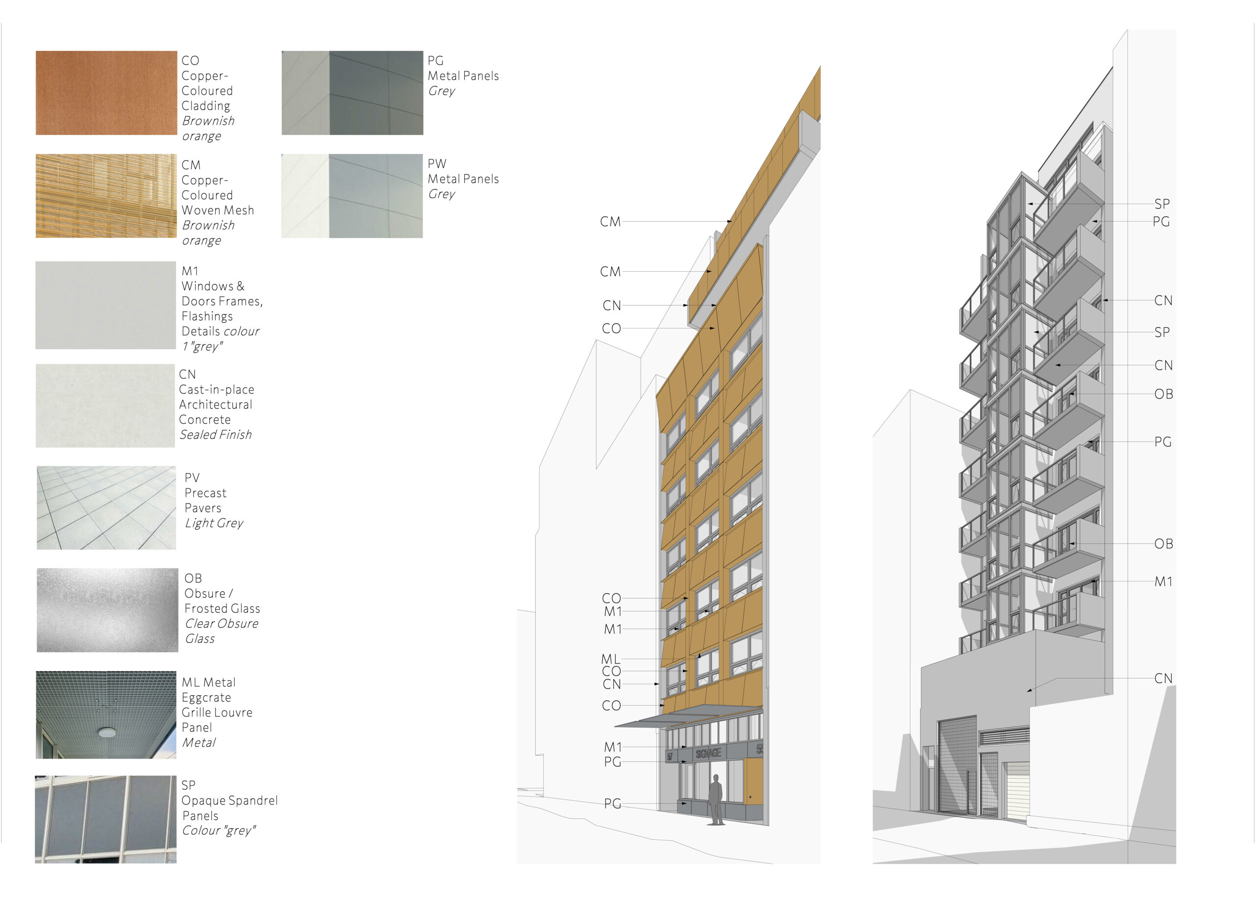Architecturally, the building takes inspiration from David Chipperfield, adopting a contemporary but understated language that respects the surrounding neighbourhood. Materials such as copper-colored cladding and woven mesh, light grey window and door systems, concrete, and terrace pavers express a refined palette, while features like frosted balcony guards and a welcoming residential lobby with a detailed neighbourhood mural enhance the project’s character. Upper levels are stepped back from the eighth floor onward to reduce massing and improve fit within the site context.